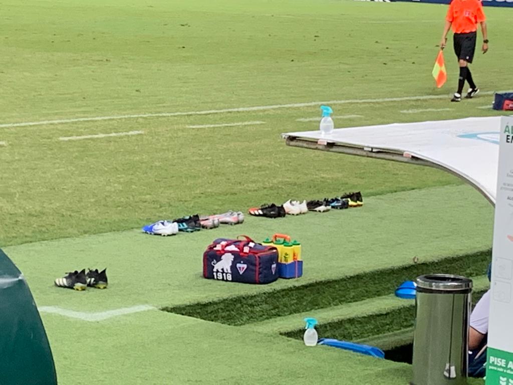 – As chuteiras dos jogadores do Fortaleza ficaram à frente do banco, caso algum deles quisesse trocar, como foi o caso do volante Ederson (a Adidas preta em separado).