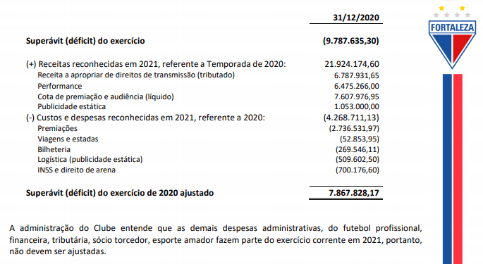 Alguns dados, no entanto, são possíveis de extrair do parecer favorável. O sócio torcedor do Fortaleza, por exemplo, levou uma receita de R$ 11 milhões ao clube. Um ótimo resultado, mas se comparado com o ano de 2019, a queda foi forte. Naquele ano, a receita com o programa de sócio superou a barreira de R$ 18 milhões.
