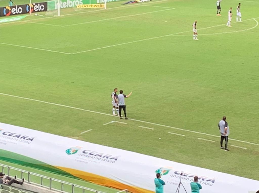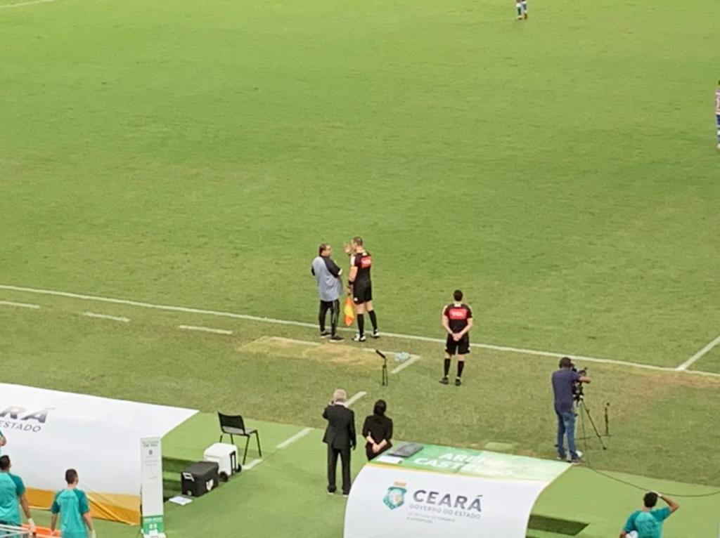 Em uma disputa de bola, que foi para a lateral, o assistente Rodrigo Correa deu a posse para o Fortaleza. O lateral Bruno Pacheco correu em direção ao bandeirinha e, assim como Vina, deu um carão daqueles: “essa bola é nossa, caralho. Tu viu que é nossa”. O atacante Wellington Paulista também correu até o assistente e ficou com os braços abertos e perguntou: “tu vai deixar ele falar isso contigo?”.