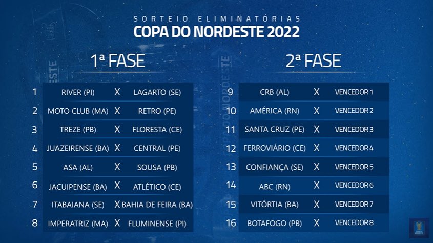 Foram definidos os confrontos das eliminatórias da 1ª Fase da Copa do Nordeste. 2 representantes cearenses participam dessa etapa. O Atlético vai encarar o Jacuipense em partida única, no interior da Bahia. Enquanto o Floresta enfrenta o Treze, em Campina Grande. Já o Ferroviário espera o vencedor de Juazeirese e Central. A 1ª Fase está prevista para acontecer nos dias 13 e 14 de outubro. A 2ª Fase deve ser realizada 2 semanas depois.