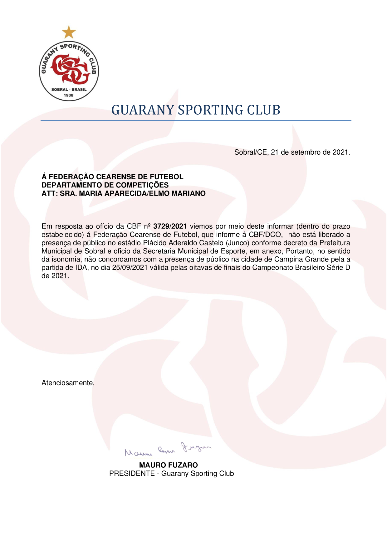 Confira abaixo o ofício com a resposta do Guarany e o da Prefeitura de Sobral