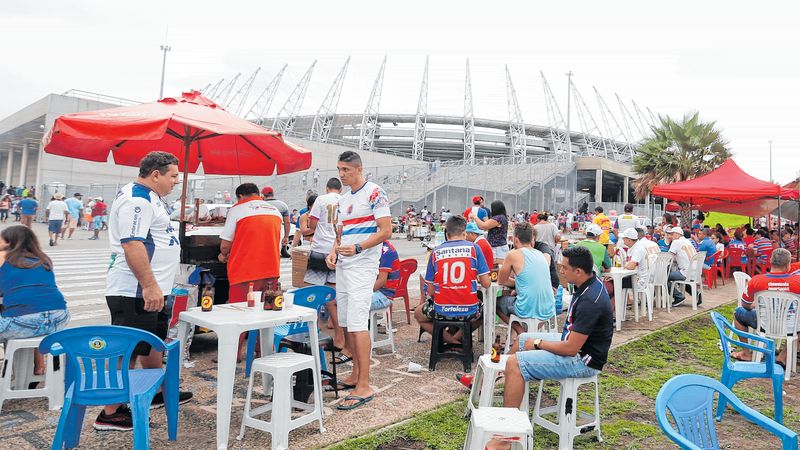 Quem vai a qualquer estádio de futebol sabe que uma das características marcantes é a venda de produtos, alimentos e bebidas no entorno da praça esportiva. Nas arenas cearense, então, cervejinha, cachaça, cai duro (pão com carne), espetinho, camisas e bandeiras dos times são algo inerente a uma partida de futebol, seja no PV, Castelão, Junco ou Romeirão.
