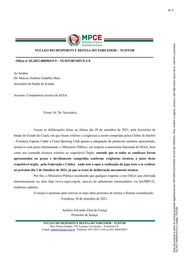 Em novo ofício, enviado à Secretária de Saúde do Estado do Ceará (SESA), o coordenador do Nudtor, Promotor de Justiça, Edvando Elias de França, “entende que se todas as condições forem apresentadas no prazo e devidamente cumpridas conforme exigências técnicas a juízo deste respeitável órgão, pela Federação e Clube, nada tem a opor a realização do jogo teste a se realizar no próximo dia 2 de outubro de 2021, já que se trata de deliberação meramente técnica”