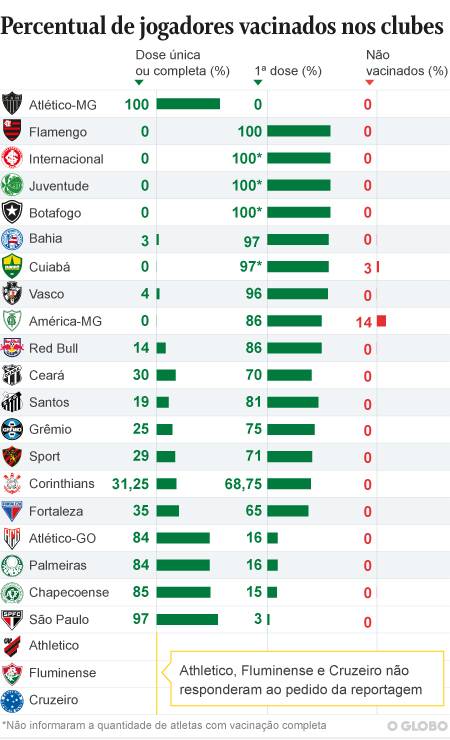 Levantamento feito pelo Jornal O Globo, publicado nesta sexta-feira, mostra que somente 2 clubes da Série A do Brasileiro possuem jogadores que ainda não foram vacinados contra a Covid: América/MG e Cuiabá.
