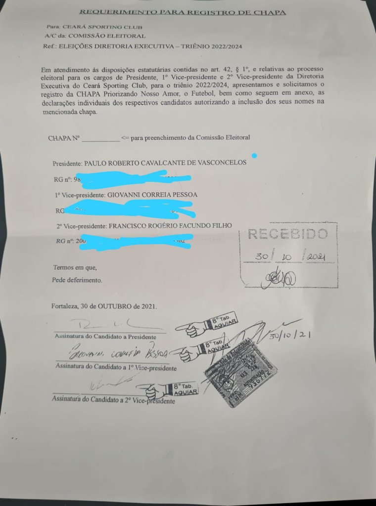 A situação também inscreveu a chapa “Fechado com o Vozão” com Robinson de Castro na Presidência, Humberto Aragão como 1º vice-presidente e Carlos Moraes como 2º vice-presidente.