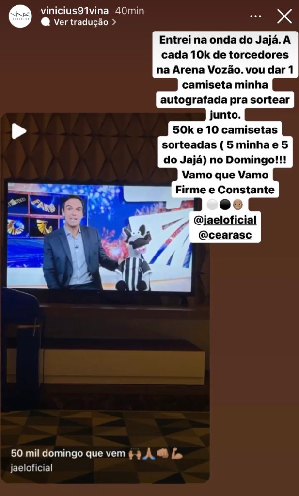 Horas depois do post do atacante Jael, o meia Vina, via stories no Instagram, também fez questão de anunciar a mesma “promoção”.
