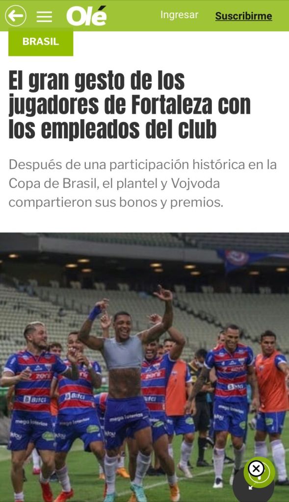 Na edição on line do principal jornal esportivo da argentina, o Diário Olé, produziu uma matéria sobre a atitude dos jogadores do Fortaleza ao dividirem a premiação recebida na Copa do Brasil com os funcionários do clube.