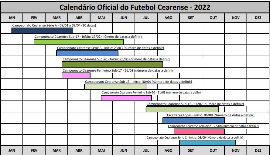 A Federação Cearense de Futebol divulgou nessa quinta-feira, o calendário das competições estaduais do próximo ano. No 1º semestre acontecem as Séries A e B, além do Sub-20 (masculino e feminino), Sub-17 e Sub-13. No 2º semestre acontecem a Série C, a Taça Fares Lopes e o Feminino, assim como o Sub-15.