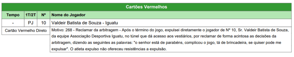 O nosso querido Manjadinho também traz algumas peculiaridades. Por exemplo, só um jogador recebeu cartão vermelho em 2 rodadas disputadas. O meio-campista Valdeir, do Iguatu. Mas segundo a súmula da partida Pacajus 1×0 Iguatu, ele meio que pediu.