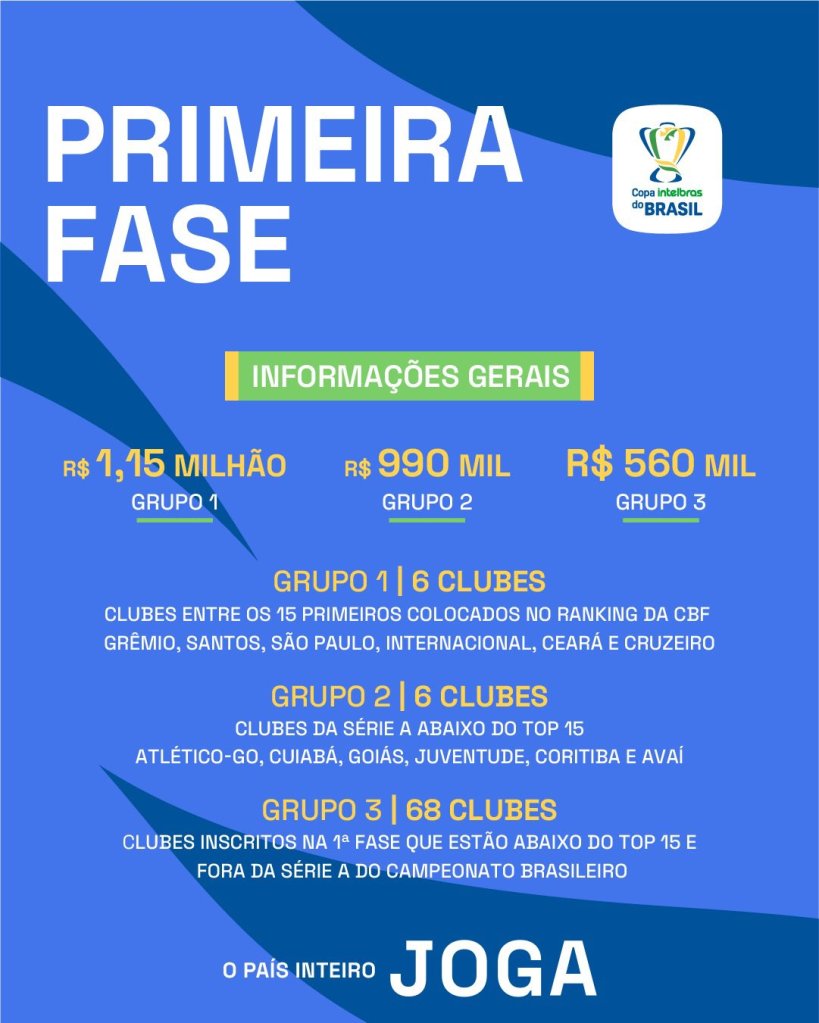 A CBF divulgou nessa segunda-feira, 17, os valores que cada equipe vai ganhar por participar da 1ª Fase da Copa do Brasil. O torneio, que contará nesta etapa inicial com 80 clubes, teve os confrontos definidos. O futebol cearense conta com 3 representantes.