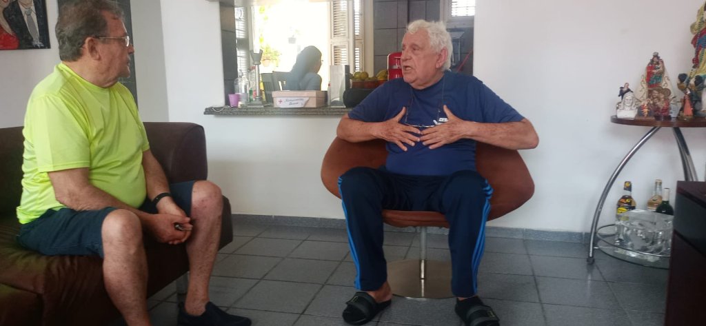 Depois de fazer uma cirurgia no coração (cateterismo), na semana passada, Júlio Salles foi liberado pelos médicos para descansar em casa, mas sem ainda poder trabalhar por alguns dias. No último domingo, o Veterano narrador da Rádio Assunção recebeu em sua casa a visita de outro gigante do rádio brasileiro: Gomes Farias. O encontro de dois dos maiores nomes da crônica esportiva nacional mostrou que ambos são exemplos de cordialidade e amizade. Farias fez questão de dizer que precisava retribuir a visita, pois quando também passou por uma cirurgia, recebera todos os dias a passada de Júlio no hospital.
