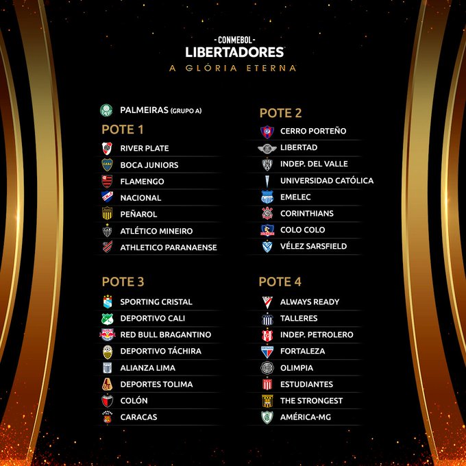 Na Libertadores, os potes estão definidos da seguinte maneira (confira na imagem abaixo). O Fortaleza está no 4 e não poderá enfrentar um time brasileiro que seja cabeça de chave na Fase de Grupos. Além disso, o Tricolor estreia em casa, no Castelão, dia 5, 6 ou 7 de abril contra uma equipe do Pote 2 e na última rodada encara esse mesmo rival, fora, dia 24, 25 ou 26 de maio.