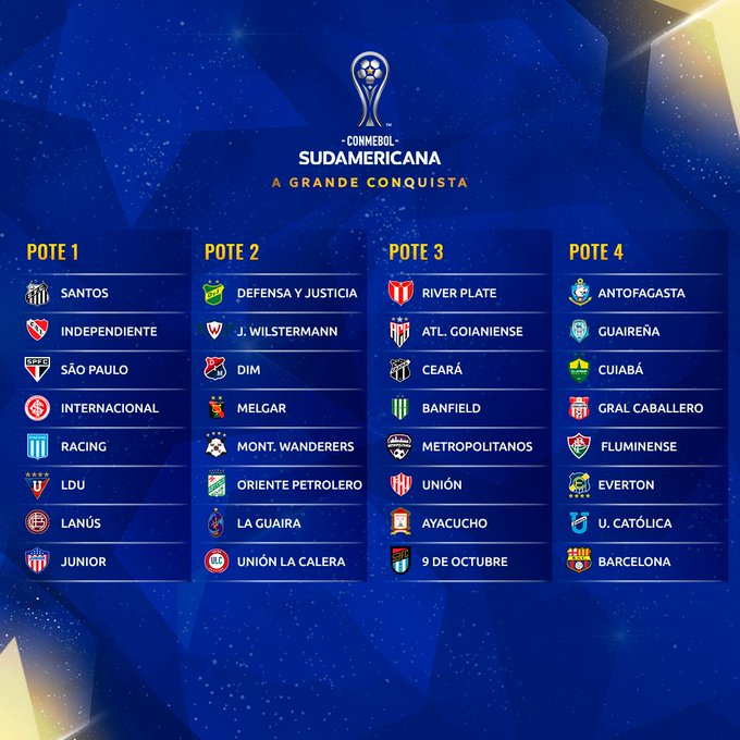Na Sul-Americana, os potes estão definidos da seguinte maneira (confira na imagem abaixo). O Ceará está no 3 e não poderá enfrentar adversários brasileiros na Fase de Grupos. Além disso, o Alvinegro estreia em casa, no Castelão, dia 5, 6 ou 7 de abril contra uma equipe do Pote 1 e na última rodada encara esse mesmo rival, fora, dia 24, 25 ou 26 de maio.