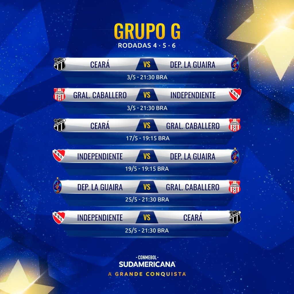 A Conmebol divulgou na tarde deste sábado, 26, a tabela detalhada da Fase de Grupos da Copa Sul-Americana. O Ceará estreia no dia 5 de abril, terça-feira, às 19h15, na Arena Castelão, contra o Independiente, do Chile.