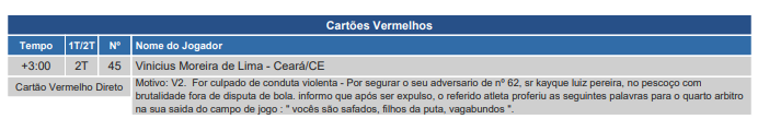 Esta é a segunda expulsão do time do Ceará nas duas rodadas de Brasileirão. Na vitória diante do Palmeiras, Vina também recebeu o vermelho. Vale lembrar que no jogo anterior, na estreia na Sul-Americana, diante do Independiente/ARG, no Castelão, Nino Paraíba também havia sido excluído da partida.