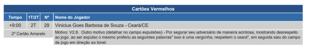 Na súmula da partida, o árbitro Caio Max (CBF/RN) relatou que o camisa 29 do Ceará recebeu o cartão vermelho por “segurar seu adversário de maneira acintosa […] e ao ser expulso proferiu as seguintes palavras: Isso é uma vergonha, respeitem o Ceará”.