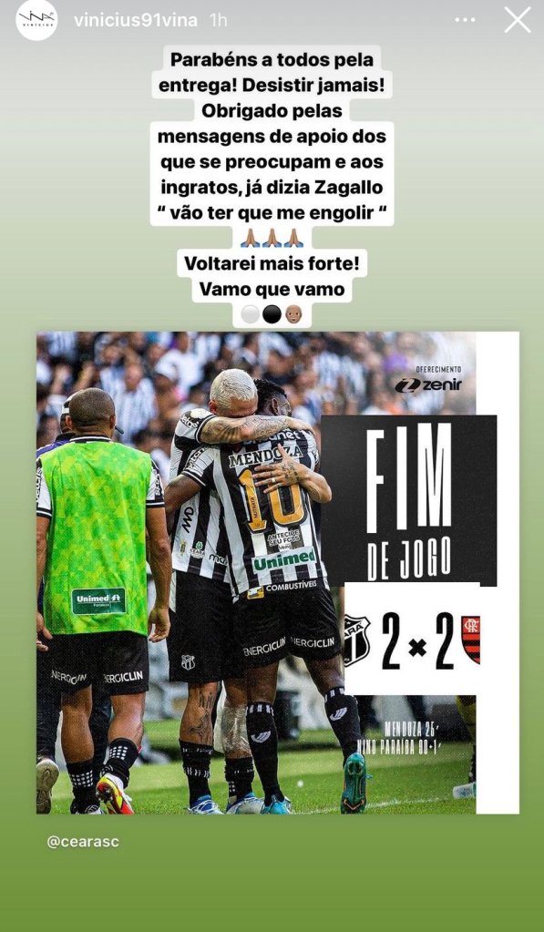 Aliás, o Camisa 29 do Vozão, se desentendeu com alguns torcedores atrás do banco, após ser vaiado e xingado por ter deixado o jogo. Inclusive, nas redes sociais, Vina deixou um recado pra essas pessoas.