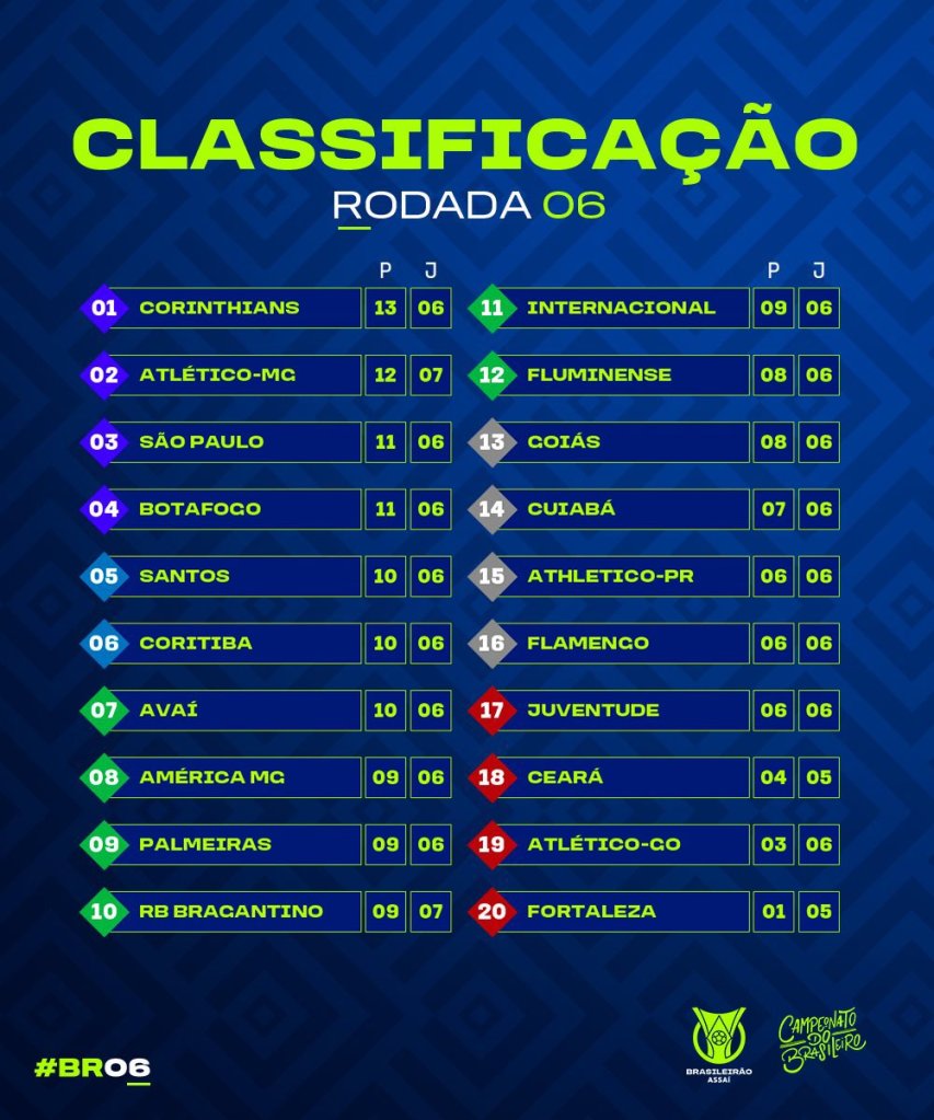 Confira abaixo a classificação atualizada do Brasileirão após a conclusão da 6ª Rodada: