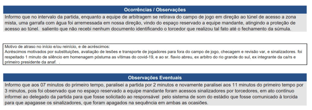 “Informo que aos 07 minutos do primeiro tempo, paralisei a partida por 2 minutos e novamente paralisei aos 11 minutos do primeiro tempo por 3 minutos, pois foi observado que no espaço reservado a equipe mandante foram acessos sinalizadores por torcedores, em ato contínuo informei ao delegado da partida para que fosse solicitado ao responsável pelo sistema de som do estádio que fosse comunicado à torcida