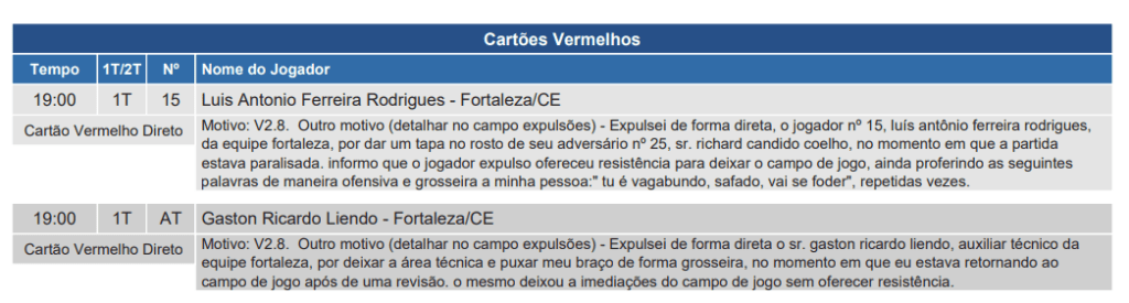 “Expulsei de forma direta, o jogador nº 15, luís antônio ferreira rodrigues, da equipe fortaleza, por dar um tapa no rosto de seu adversário nº 25, sr. richard candido coelho, no momento em que a partida estava paralisada. informo que o jogador expulso ofereceu resistência para deixar o campo de jogo, ainda proferindo as seguintes palavras de maneira ofensiva e grosseira a minha pessoa:” tu é vagabundo, safado, vai se foder”, repetidas vezes.”