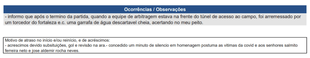 O motivo do julgamento é devido o relato do árbitro Anderson Daronco na súmula da partida Fortaleza 0x1 Fluminense realizado no último dia 22 de maio, na Arena Castelão, pelo Brasileirão. O juiz descreveu que um torcedor do Fortaleza jogou uma garrafa de água cheia e acertou o seu peito.