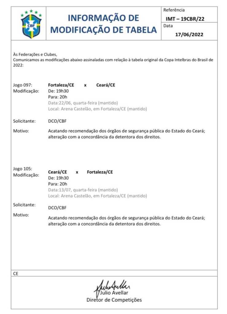 A CBF mudou o horário das 2 partidas pelas Oitavas de Final da Copa do Brasil envolvendo Ceará e Fortaleza, que vão acontecer na próxima quarta-feira, 22 de junho, e 13 de julho e estavam agendados para as 19h.