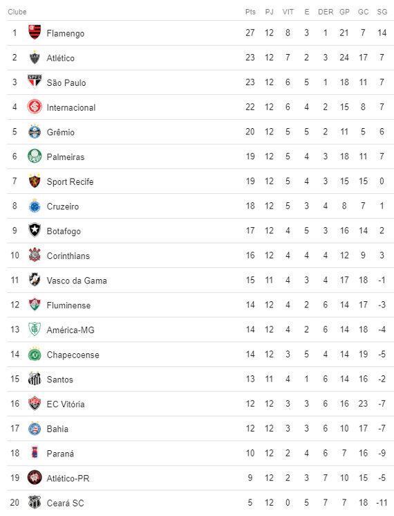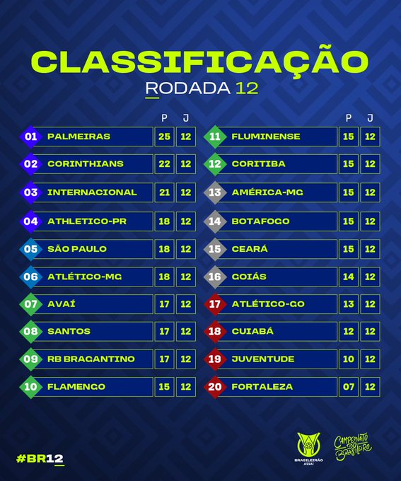 Abaixo, confira a classificação do Brasileirão de 2018 e de 2022 com 12 rodadas disputadas.