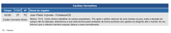 Com o vermelho recebido, Vojvoda não poderá comandar o Fortaleza na próxima partida pelo Brasileirão, diante do Atlético/MG sábado que vem, às 21h, no Mineirão. Já para o 1º Clássico-Rei decisivo das Oitavas de Final da Copa do Brasil, contra o Ceará, o treinador tricolor poderá estar na área técnica.