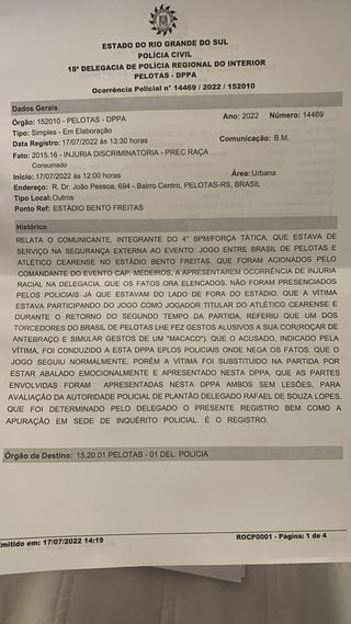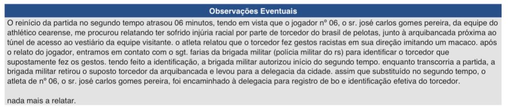 O reinício da partida no segundo tempo atrasou 06 minutos, tendo em vista que o jogador nº 06, o sr. josé carlos gomes pereira, da equipe do athlético cearense, me procurou relatando ter sofrido injúria racial por parte de torcedor do brasil de pelotas, junto à arquibancada próxima ao túnel de acesso ao vestiário da equipe visitante. o atleta relatou que o torcedor fez gestos racistas em sua direção imitando um macaco. após o relato do jogador, entramos em contato com o sgt. farias da brigada militar (polícia militar do rs) para identificar o torcedor que supostamente fez os gestos. tendo feito a identificação, a brigada militar autorizou início do segundo tempo. enquanto transcorria a partida, a brigada militar retirou o suposto torcedor da arquibancada e levou para a delegacia da cidade. assim que substituído no segundo tempo, o atleta de nº 06, o sr. josé carlos gomes pereira, foi encaminhado à delegacia para registro de bo e identificação efetiva do torcedor.