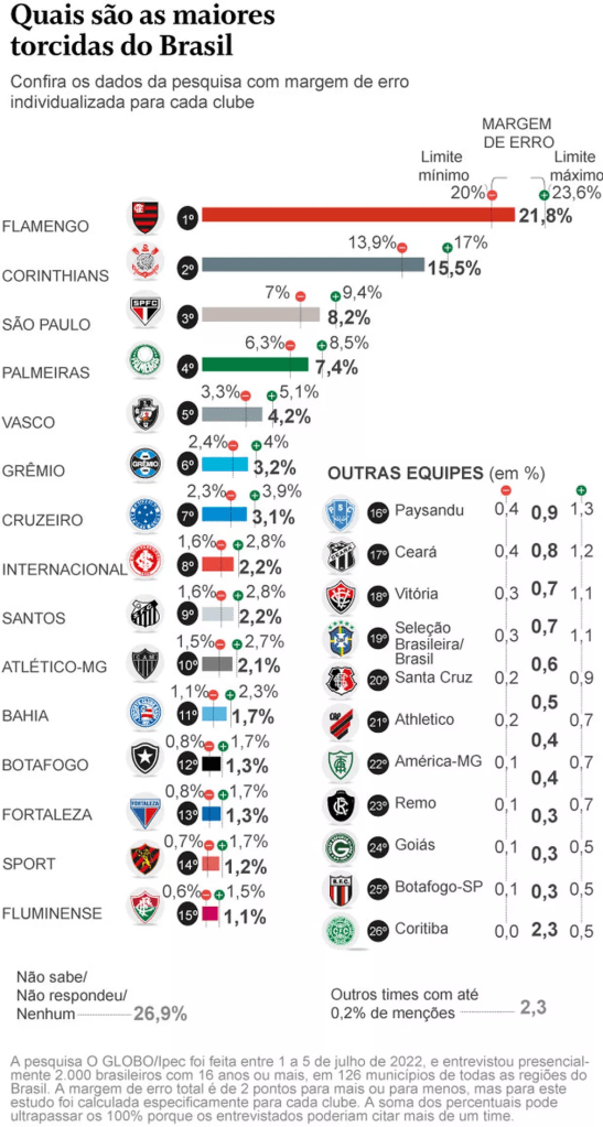 A margem de erro é de 2 pontos percentuais para mais ou para menos. A pesquisa foi realizada no formato espontâneo, sem que nenhum dos entrevistados tivesse opção para responder: qual time brasileiro você torce ou tem simpatia? Com a possibilidade de citar uma 2ª escolha.