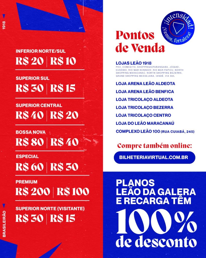 Domingo que vem, às 18h, na Arena Castelão, diante do Internacional, os valores dos bilhetes começam a partir de R$ 10. A venda foi iniciada nesta terça-feira, nas lojas oficiais do clube tricolor. A expectativa é de um público próximo a 50 mil torcedores.