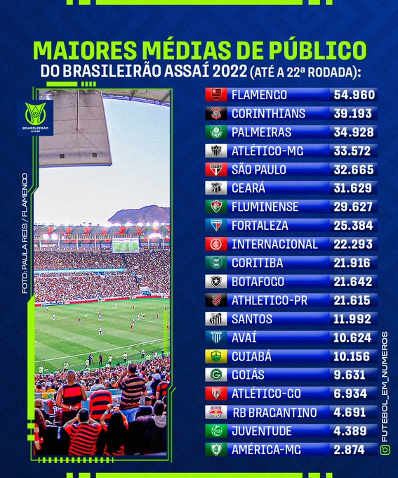 A média de público do Brasileirão segue alta. Enquanto Flamengo lidera com uma média de mais de 54 mil torcedores por partida, o Ceará está em 6º lugar com média superior a 31 mil alvinegros por jogo. O Fortaleza é o 8º com mais de 25 mil tricolores por jogo.
