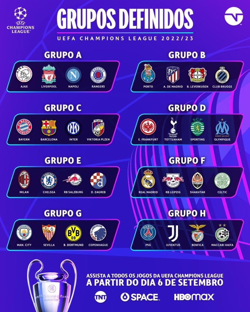 Competição de clubes mais badalada do planeta, a Liga do Campeões da Europa definiu os 32 times nos 8 grupos da edição 2022/23. O torneio terá confrontos interessantes na fase de grupos como PSG x Juventus, Bayern x Barcelona e Milan x Chelsea. Vale lembrar que a Final esta marcada para o dia 10 de junho de 2023 e será realizada no Atatürk Olympic Stadium, em Istambul. A HBO Max, no Streaming, a TNT, na TV fechada, e o SBT, na TV aberta, transmitem.