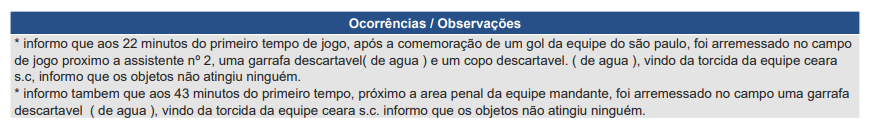 “informo que aos 22 minutos do primeiro tempo de jogo, após a comemoração de um gol da equipe do são paulo, foi arremessado no campo de jogo próximo a assistente nº 2, uma garrafa descartável ( de agua ) e um copo descartável. ( de agua ), vindo da torcida da equipe ceara s.c, informo que os objetos não atingiu ninguém.