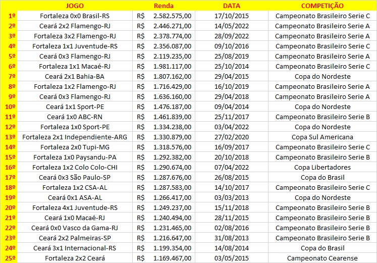 Confira abaixo os jogos com maiores rendas do futebol cearense: