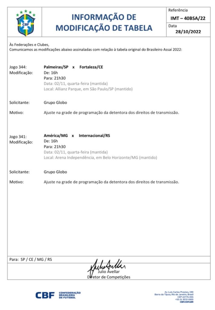 A CBF atendeu a um pedido da TV Globo e alterou o horário da partida entre Palmeiras e Fortaleza, que acontecerá, na próxima quarta-feira, dia 2 de novembro, feriado de Finados, no Allianz Parque. O jogo estava marcado inicialmente para as 16h, mas agora será às 21h30.