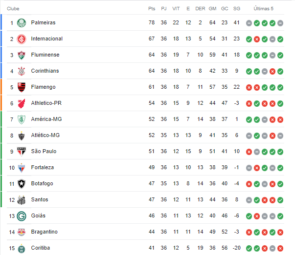 Confira abaixo como está a classificação e os jogos dos concorrentes diretos na briga pela vaga à Pre-Libertadores: