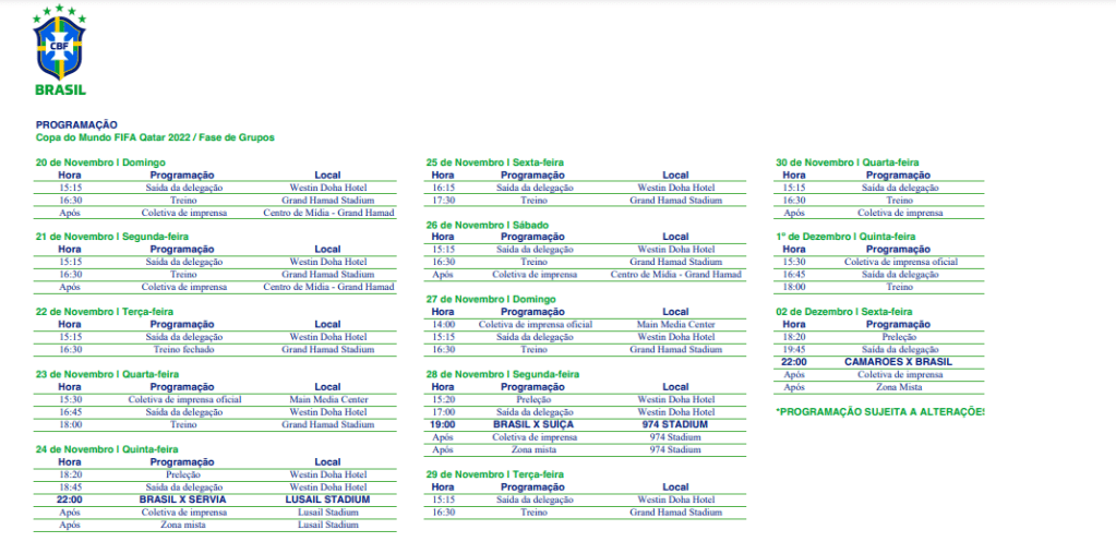 O Brasil estreia no dia 24 de novembro, quinta-feira, às 16h (horário cearense), contra a Sérvia, no Estádio Lusail. Confira abaixo a programação, ou se preferir clique aqui para baixar.