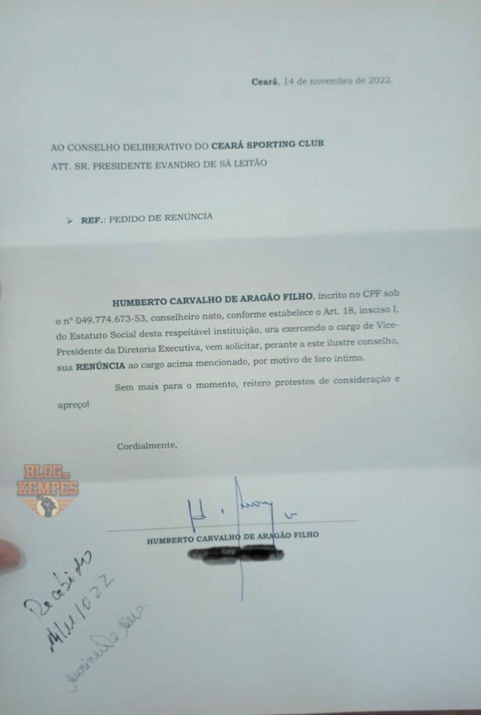 O vice-presidente do clube, Humberto Aragão Filho, renunciou nesta segunda-feira, 14. O dirigente entregou a carta ao Conselho Deliberativo.