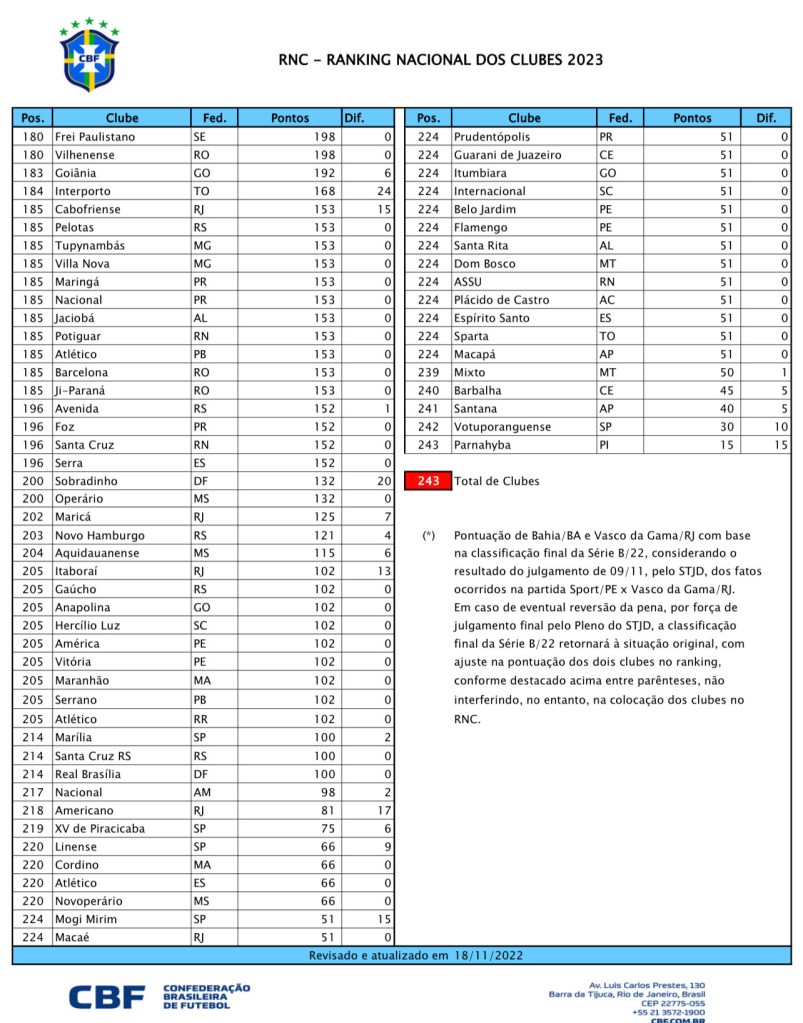 Os outros cearenses no ranking são: Guarany de Sobral 117º, Icasa 132º, Crato e Pacajus em 157º , Caucaia 168º, Guarani de Juazeiro 224º e Barbalha 240º. Confira abaixo o Ranking completo: