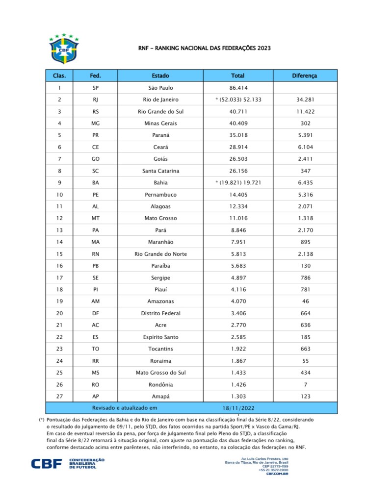 Esses e muitos outros fatores tiraram o futebol cearense do 11º lugar no ranking da CBF em 2010 para o 6º lugar em 2022. A entidade nacional divulgou a lista com a tabela de classificação das federações. E a FCF manteve-se à melhor do Norte/Nordeste/Centro-Oeste, ultrapassou a catarinense e chegou ao G6.