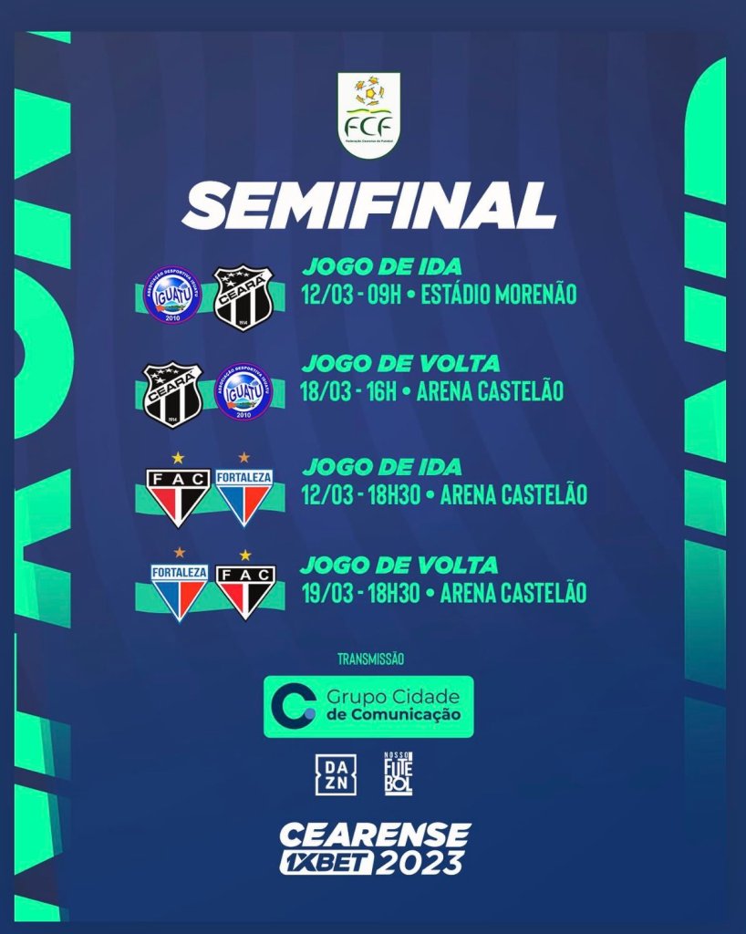A TV Cidade vai transmitir todos os 4 jogos das semifinais do Estadual. As partidas de volta estão marcadas para o outro final de semana 18/03 – 16h – Ceará x Iguatu – Arena Castelão – e 19/03 – 18h30 – Fortaleza x Ferroviário – Arena Castelão.