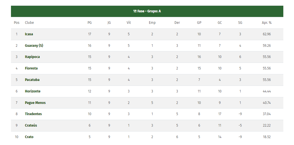 Nos outros 4 jogos, destaques para os triunfo do Icasa sobre o Floresta, por 2×1, que garantiu o Verdão do Cariri em 1º lugar, e do Guarany de Sobral também por 2×1 sobre o Horizonte, que levou o Cacique do Vale ao 2º lugar.