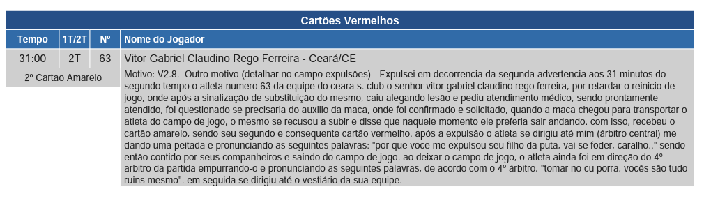 “ Expulsei em decorrencia da segunda advertencia aos 31 minutos do segundo tempo o atleta numero 63 da equipe do ceara s. club o senhor vitor gabriel claudino rego ferreira, por retardar o reinicio de jogo, onde após a sinalização de substituição do mesmo, caiu alegando lesão e pediu atendimento médico, sendo prontamente atendido, foi questionado se precisaria do auxilio da maca, onde foi confirmado e solicitado, quando a maca chegou para transportar o atleta do campo de jogo, o mesmo se recusou a subir e disse que naquele momento ele preferia sair andando. com isso, recebeu o cartão amarelo, sendo seu segundo e consequente cartão vermelho. após a expulsão o atleta se dirigiu até mim (árbitro central) me dando uma peitada e pronunciando as seguintes palavras: “por que voce me expulsou seu filho da puta, vai se foder, caralho..” sendo então contido por seus companheiros e saindo do campo de jogo. ao deixar o campo de jogo, o atleta ainda foi em direção do 4º arbitro da partida empurrando-o e pronunciando as seguintes palavras, de acordo com o 4º árbitro, “tomar no cu porra, vocês são tudo ruins mesmo”. em seguida se dirigiu até o vestiário da sua equipe”.