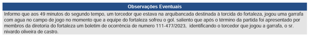 “Informo que aos 49 minutos do segundo tempo, um torcedor que estava na arquibancada destinada à torcida do fortaleza, jogou uma garrafa com agua no campo de jogo no momento que a equipe do fortaleza sofreu o gol. saliento que após o término da partida foi apresentado por membros da diretoria do fortaleza um boletim de ocorrência de numero 111-477/2023, identificando o torcedor que jogou a garrafa, o sr. nivardo oliveira de castro”.