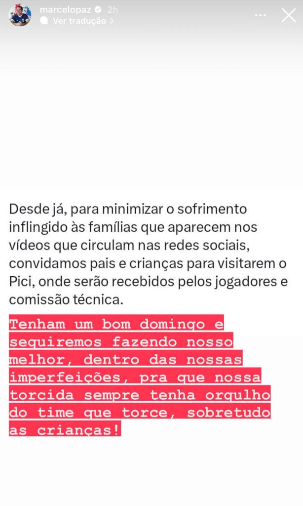 “Nosso sincero pedido de desculpas, a todos! Erramos e vamos corrigir! Tenham um bom domingo e seguiremos fazendo nosso melhor, dentro das nossas imperfeições, pra que nossa torcida tenha sempre tenha orgulho do time que torce, sobretudo as crianças!”, disse Paz.