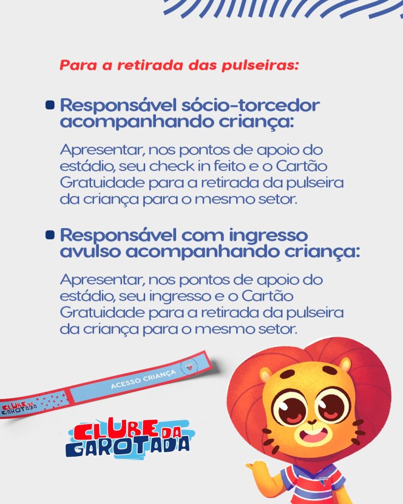 A nova medida passa a valer na próxima terça-feira, quando será iniciado o cadastro e a retirada do Cartão de Gratuidade. Será necessário que o responsável da criança vá até nossa Loja do Pici ou Conceito. Com isso, no dia do jogo, o torcedor precisa apresentar o cartão na Bilheteria da Premium ou em dois pontos de apoio da esplanada da Arena Castelão para retirada da pulseira de acesso ao jogo.