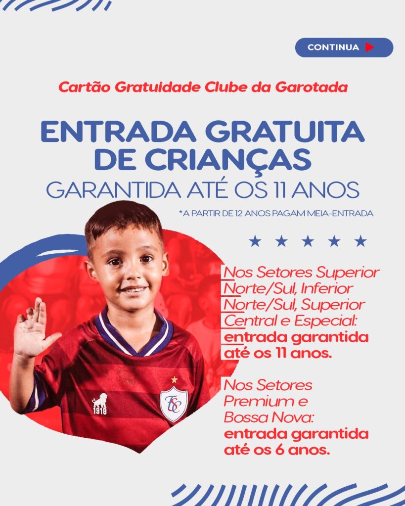 O Fortaleza lançou nesse sábado o cartão de gratuidade para crianças chamado: “Clube da Garotada”. A partir de agora, a meninada até 11 anos tem acesso livre na Arena Castelão aos setores Central, Especial, Superior Norte e Sul e Inferior Norte Sul. Enquanto as crianças até 6 anos terão ainda entrada liberada para os setores Bossa Nova e Premium.