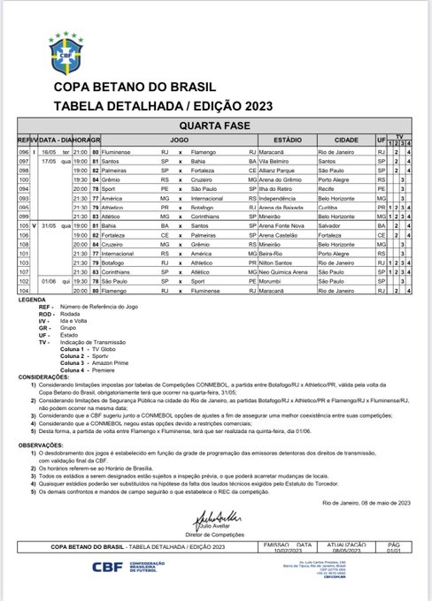 Faltando 8 dias para o início das oitavas final da Copa do Brasil, enfim, a CBF divulgou na noite dessa segunda-feira, 08, a tabela detalhada dos 8 confrontos de mata-mata do torneio nacional.