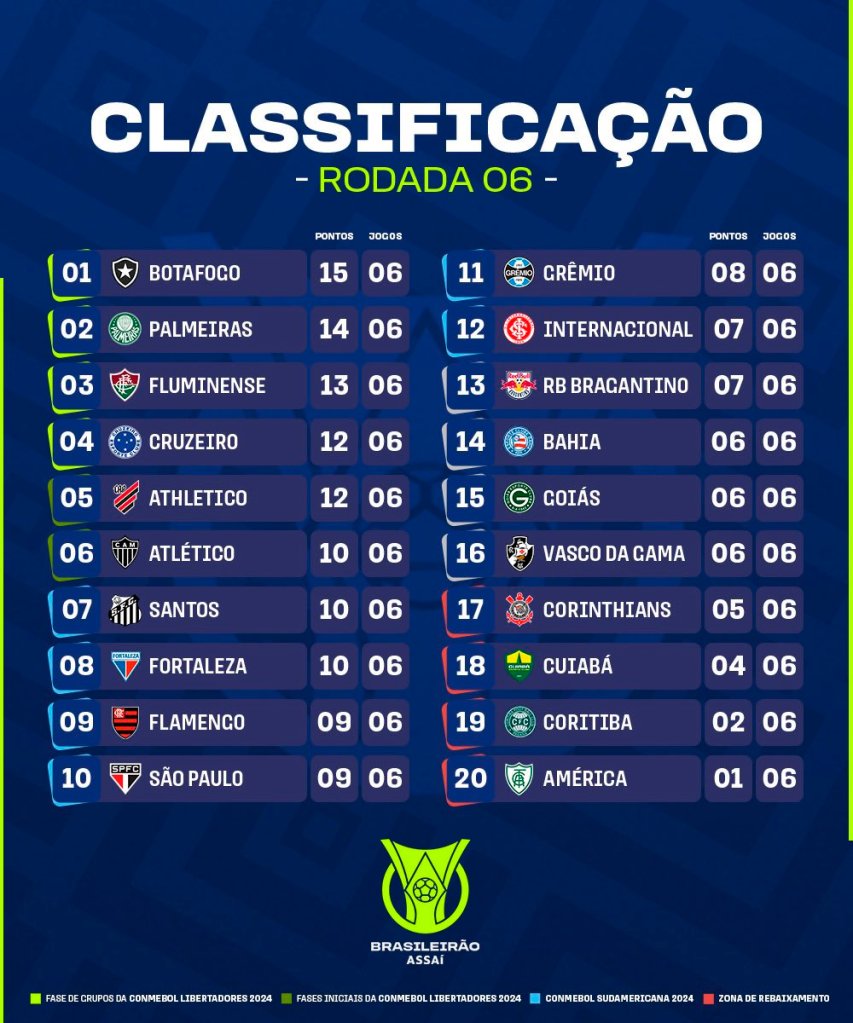 Finalizada a 6ª Rodada da Série A do Brasileiro, o Botafogo continua na liderança, mas a equipe carioca perdeu a invencibilidade ao ser derrotada fora de casa por 2×1 para o Goiás. Aliás, o time goiano deixou o Z4 e colocou o Corinthians entre os 4 últimos.